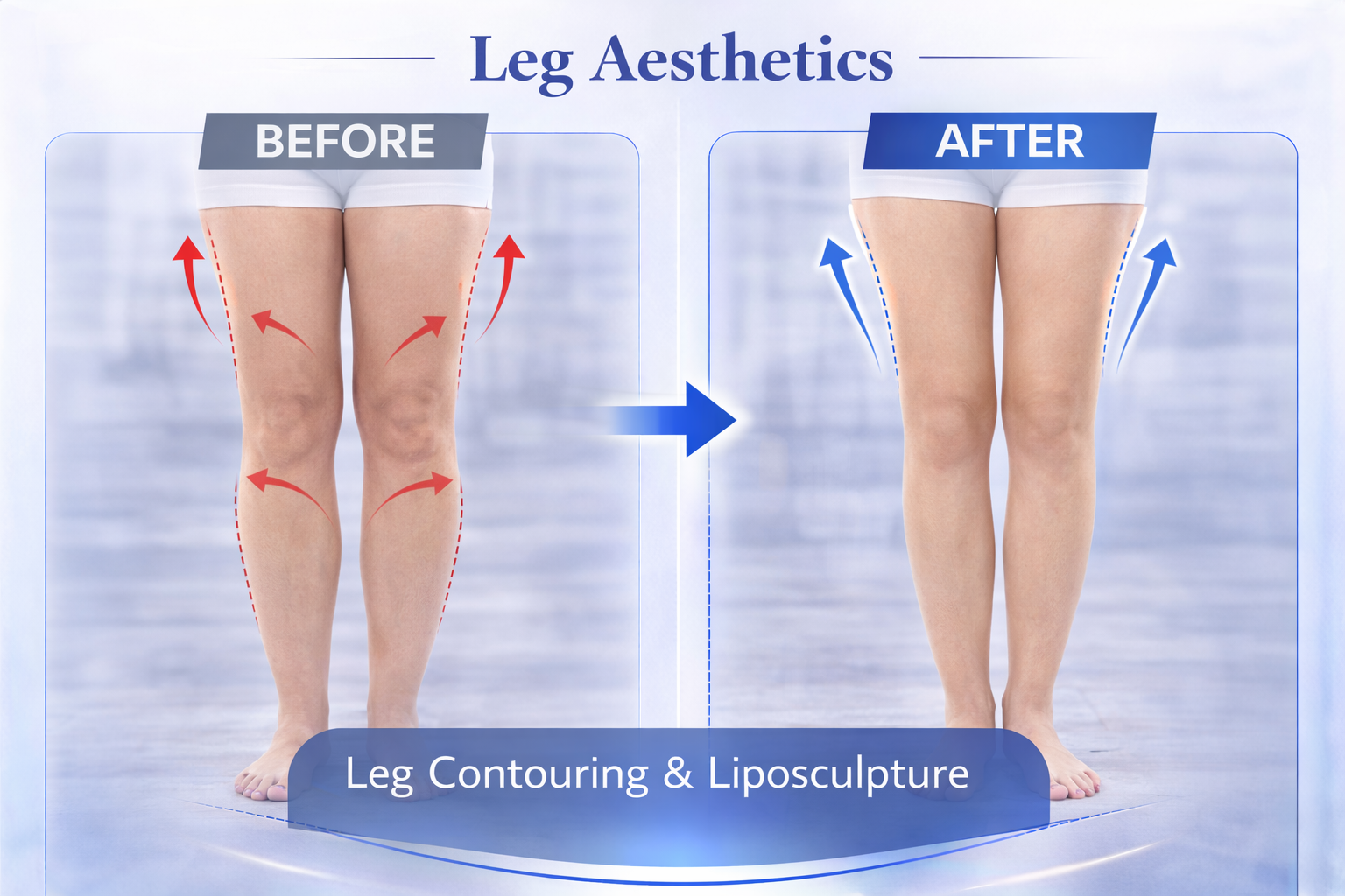 We correct O-leg (bow leg) and X-leg (knock knee) appearance by filling deficient areas and reducing excess. The aim is a straighter leg line and more balanced proportions.